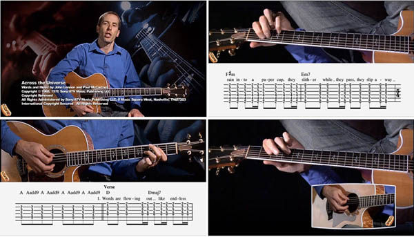 Each song starts with a lesson from a professional guitar teacher. Then, the teacher performs the complete song along with professionally recorded backing tracks. You can choose to turn the guitar off if you want to play along or leave the guitar in the mix to hear how it should sound. You can also choose from three viewing options!