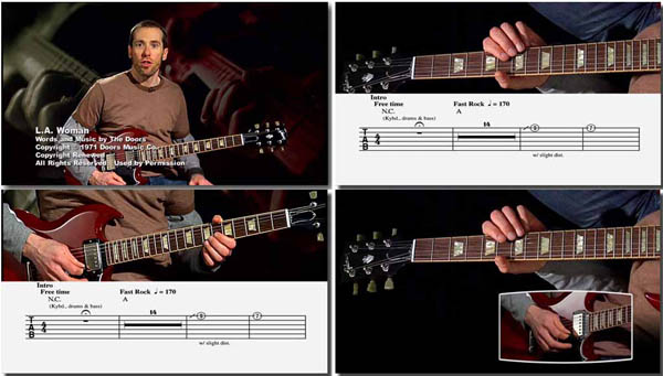 Each song starts with a lesson from a professional guitar teacher. Then, the teacher performs the complete song along with professionally recorded backing tracks. You can choose to turn the guitar off if you want to play along or leave the guitar in the mix to hear how it should sound. You can also choose from three viewing options!