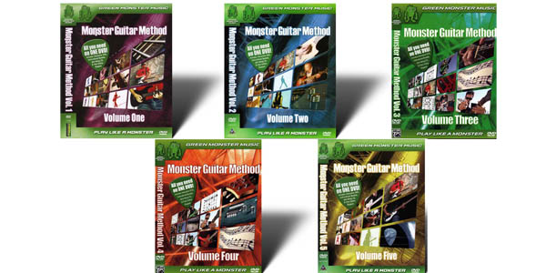 the bouncing ball' style graphics. Go from zero to hero in no time! Volume 1 covers all the basics and then some. Major and minor scales, basic cords to power cords, how to read rhythmic notation and even strumming patterns. Learn how to find any note on the fretboard without the use of a chart. In no time, even beginners will be jamming 12 bar blues and playing licks. The Green Monster Music series is equivalent to attending music school, while allowing students to learn at their own pace and on their own schedule.