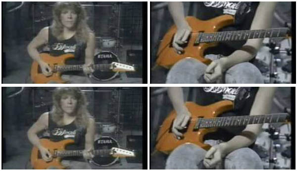 Racer X guitarist Bruce Bouillet gives some insight into his high-tech heavy metal soloing style in this instructional video, with special attention given to the basic modes, pentatonic and blues scales, and arpeggio sequences. The latter department is really where Bouillet is most helpful, as he demonstrates how