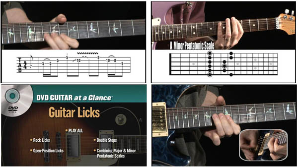 A first of its kind, the At a Glance series pairs an instructional DVD lesson taught by a professional guitarist with a supplemental book for a comprehensive learning experience. Each book/DVD features several lessons pertaining to one topic, and the DVD lessons feature on-screen music. The lessons are loaded with valuable tips and information. Guitar Licks – At a Glance features four lessons: Rock Licks, Open-Position Licks, Double Stops, and Combining Major and Minor Pentatonics.