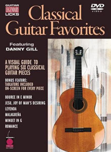 The Classical Guitar Favorites DVD provides a visual guide for playing six classical guitar pieces. Includes tablature on-screen for every piece. Contents: Classical Guitar & Techniques Overview (7:34) Bouree In E Minor (21:33) Jesu, Joy Of Man's Desiring (19:32) Leyenda (Excerpt) (23:07) Malagueña (13:42) Minuet In G (21:00) Romance (Gomez) (21:27)