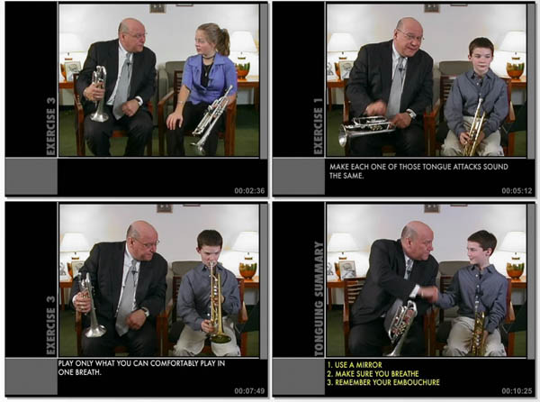 to intermediate player, plus an advanced lesson; interviews with five featured students; footage of a recording session with Mr. Vache's band; history of the trumpet; a visit to the Musical Instrument Department of the Metropolitan Museum of Art; a tour of the Yamaha Brass Instruments facility; a how-to section of the proper care and cleaning of trumpets; sheet music that can be printed out on a PC - including all the parts for the songs in the recording session; and much more. Includes lessons in English, Spanish, Chinese, Japanese, French and German.
