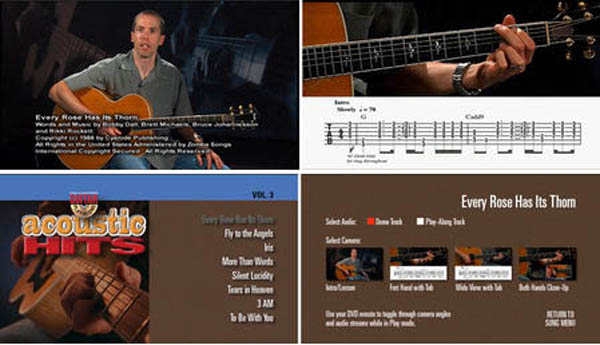 Each song starts with a lesson from a professional guitar teacher. Then, the teacher performs the complete song along with professionally recorded backing tracks. You can choose to turn the guitar off if you want to play along or leave the guitar in the mix to hear how it should sound. You can also choose from three viewing options!